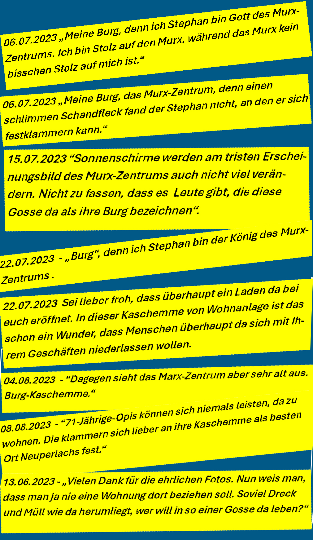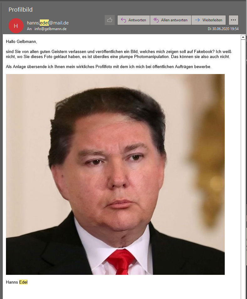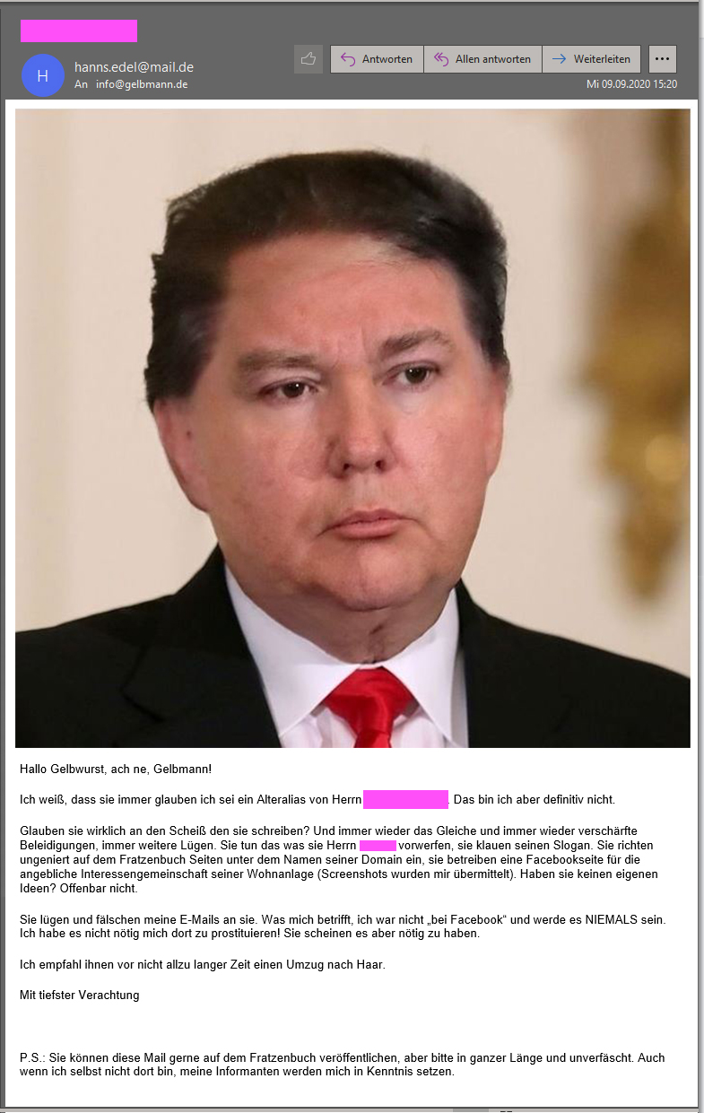 Jetzt steht es in den Gerichtsakten. Mein Stalker beschuldigt, nicht wie wir alle vermutet hatten, er, Herr {#klarname}, verstecke sich feige und hinterhältig hinter diesem asiateischen Fake-Bild aus dem Internet, sondern es sei der türkischer Bewohner Isa K. vom Karl Marx-Ring. Demnach ist es auch Isa K., der Briefe mit Lügen, Hass und Hetze an die GEWOFAG verschickt habe und geschäftsschädigende Hetze gegen das türkische Lokal im Marx-Zentrum, "GLOBAL", und auch mich betreibt. Die(se) Aussage(n) von Herrn {#klarname} vor Gericht, habe ich mir ganz bewuss etwas kosten lassen, womit sich auch die Frage gekärt hat, weshalb ich unbedingt diese Verhandlung wollte und mit dem Ergebnis, mehr als zufrieden bin. Zu hoffen bleibt, dass {#klarname}, wenn er als Zeuge gegen Isa K. aussagt, glaubwürtig ist. Jetzt habe ich das, was ich wollte :-))