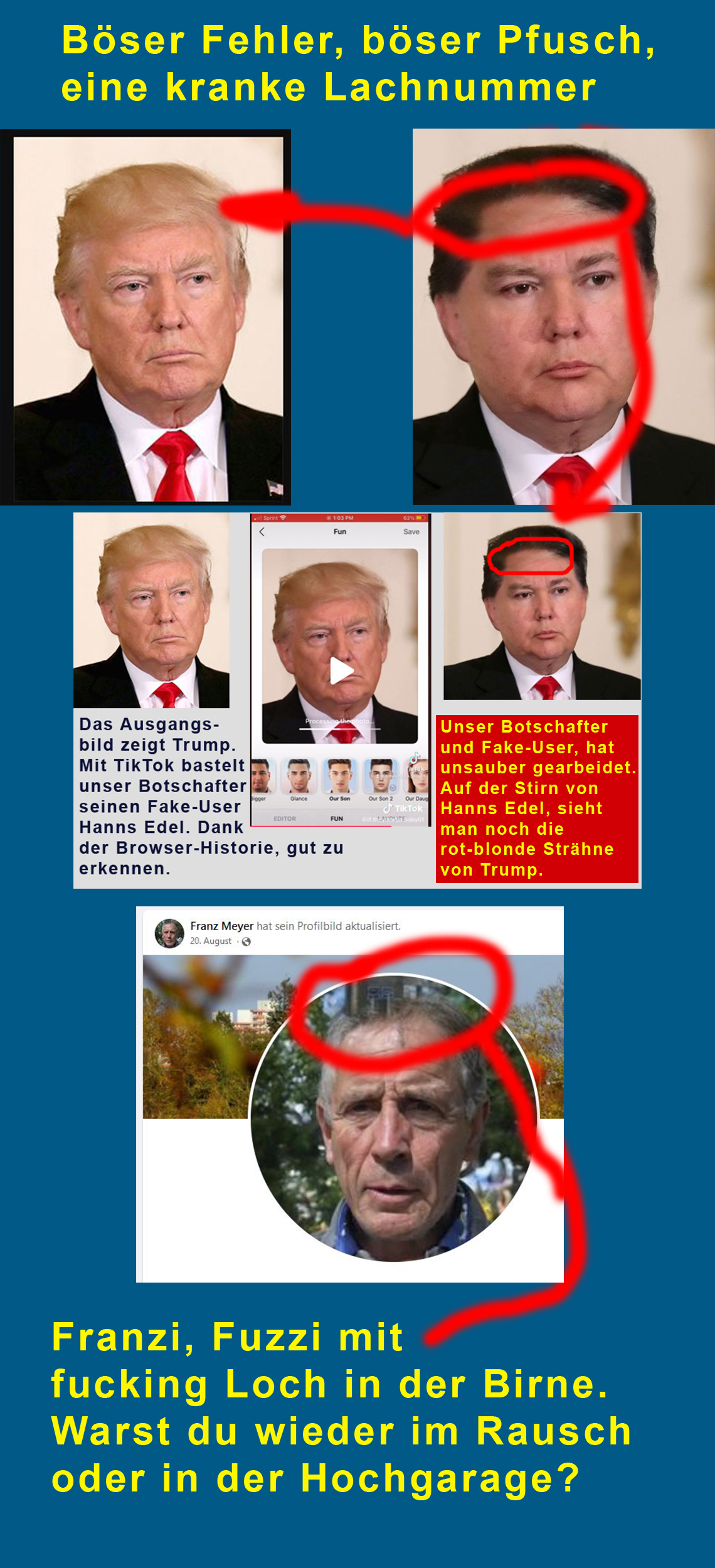Mit einem TikTok-Filter wurde mit dem Bild von Trump und einem anderen Fotos, Fake-User, Hanns Edel, erzeugt. Auf der Stirn erkennt man noch die Haarsträhne Trumps, echter Pfusch.