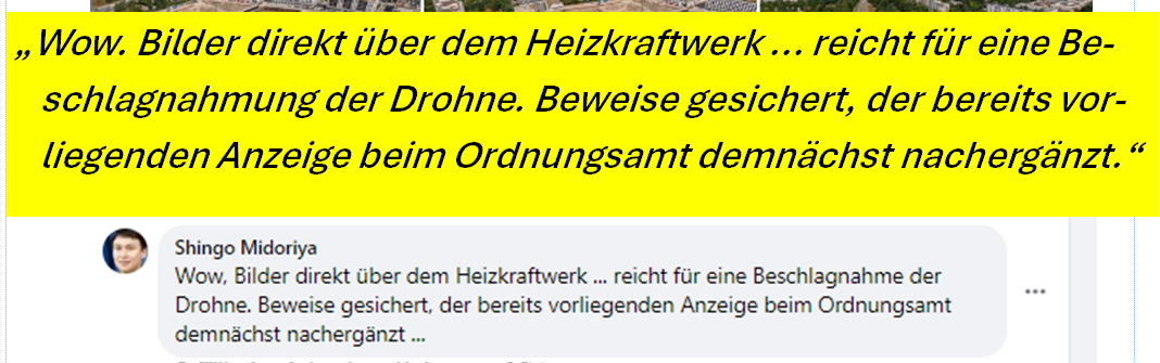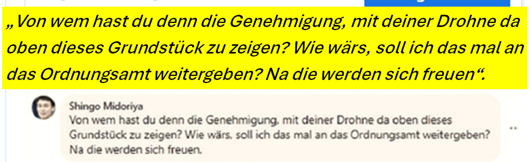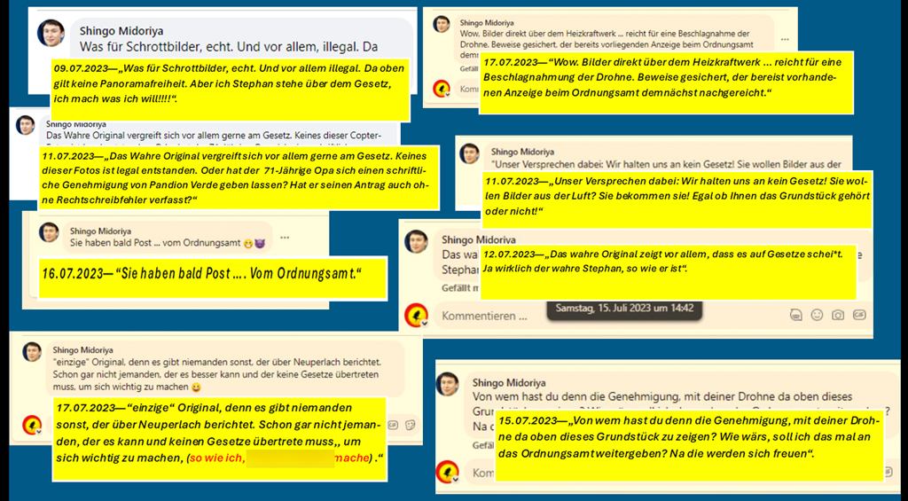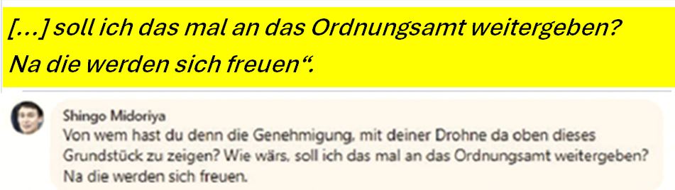 Der ungelernte Hilfs- und Gelegenheitsarbeiter, der sich wegen des Fehlens einer ordentlichen Berufsausbildung mit duzenden Fake-Berufsbezeichnungen wie "Schriftsteller, Journalist, Übersetzer, IT-Berater, Lektor..." schmückt, behauptet fast ein Jahr später, am 15.07.2023, die Aussage von dem Regierungsbeamten der Regierung Oberbayern, Abteilung Luftamt Südbayern, sei falsch und somit ungültig. Meine Copter-Aufnahmen seien alle illegal entstanden, sind strafbare Unterstellungen und Falschaussagen. Er habe mich beim Ordnungsamt angezeigt und der Saubermann, sammle weiter Beweise gegen mich, verkündet der kranke Mann stolz auf Facebook. Denunzierungen, die nur dazu dienen, anderen zu schaden, sind strafbar. Nicht nur mein psychisch kranker Stalker sammelt Beweise für das Ordnungsamt, sondern ich habe schon gerichtsverwertbar vorgelegt. Nur es dauert halt etwas, aber jetzt bist du fällig!