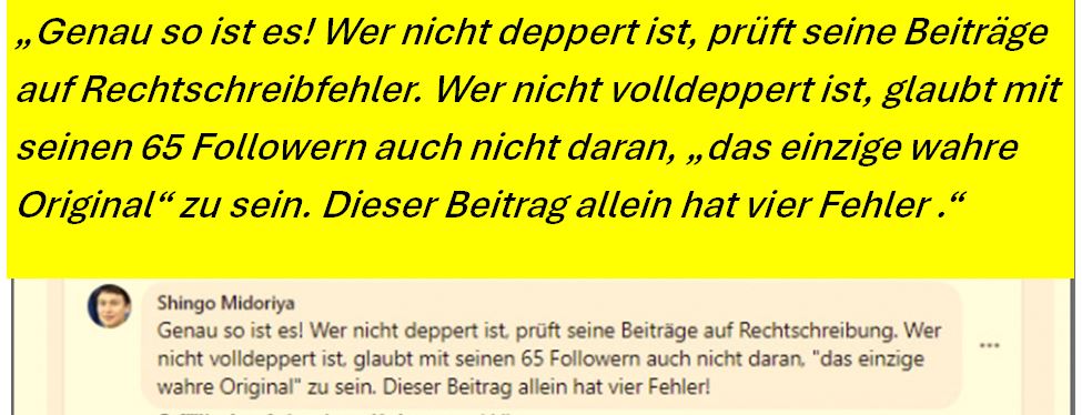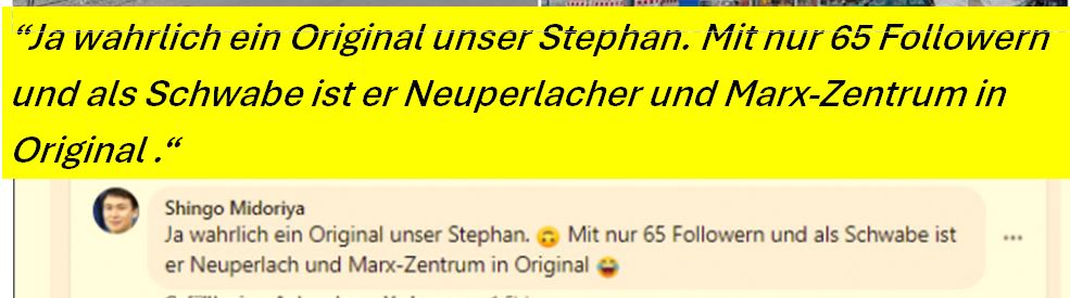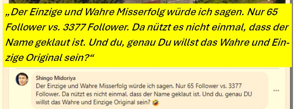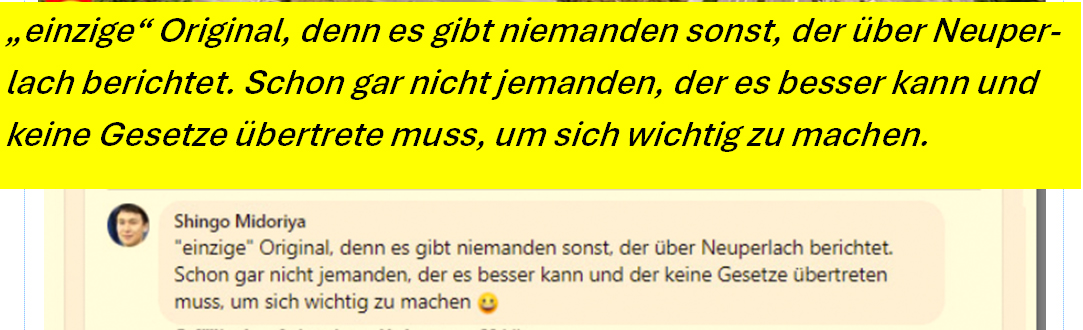 So einer, der in seinem Leben nichts erreicht hat, stellt sich mit seinen falschen Tatsachenbehauptungen über einen Beamten der Regierung Oberbayern, der im Luftamt Oberbayern, u.a. für genau solche Aktivitäten rund um das Thema UAS zuständig ist und behauptet, das "OK" von diesem Beamten zu meinen Fotos sei falsch und ungültig und er, der kranke Stalker, habe das Wissen, was richtig und falsch sei und er wisse, dass alle meine Aufnahmen illegal sind? Auf Facebook betreibe ich eine Seite mit dem Namen neuperlach.org, dem einzigen und wahren Original auf Facebook. Das allerdings tut meinem Stalker sehr weh. Er möchte das doch diesen Titel für sich haben. Daher schreibt der Ekelige, heute wieder als asiatischer Boy mit dem Fake-Namen Shingo Bingo Bongo, o.ä. [...] der es besser kann und der keine Gesetze übertreten muss, um sich wichtig zu machen [...] meine Ergänzung: "... um sich wichtig zu machen, so wie ich, euer Saubermann"