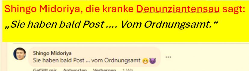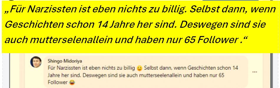 Angang Juni 2023 hat hat mein Stalker vermutlich einen sehr schweren psychischen Schub erhalten. Innerhalb dieses Schubs kreierte er die Fantasie-Figur „Shingo Midoriya“, dessen Foto bei TikTok und russischen Partnervermittlungsforen zu finden ist, und begann damit, aggressiv und in einer abartigen und kranken Art und Weise, mich zu belästigen und strafbar zu denunzieren. Wie in einem Rausch begann dann der kranke Stalker im Zeitraum von Juni 2023 bis August 2023, mich mit über 140 Hass- und Hetzkommentare unter meinen Beiträgen in Facebook, zu beleidigen, zu belästigen, zu denunzieren und mich zu bedrohen.