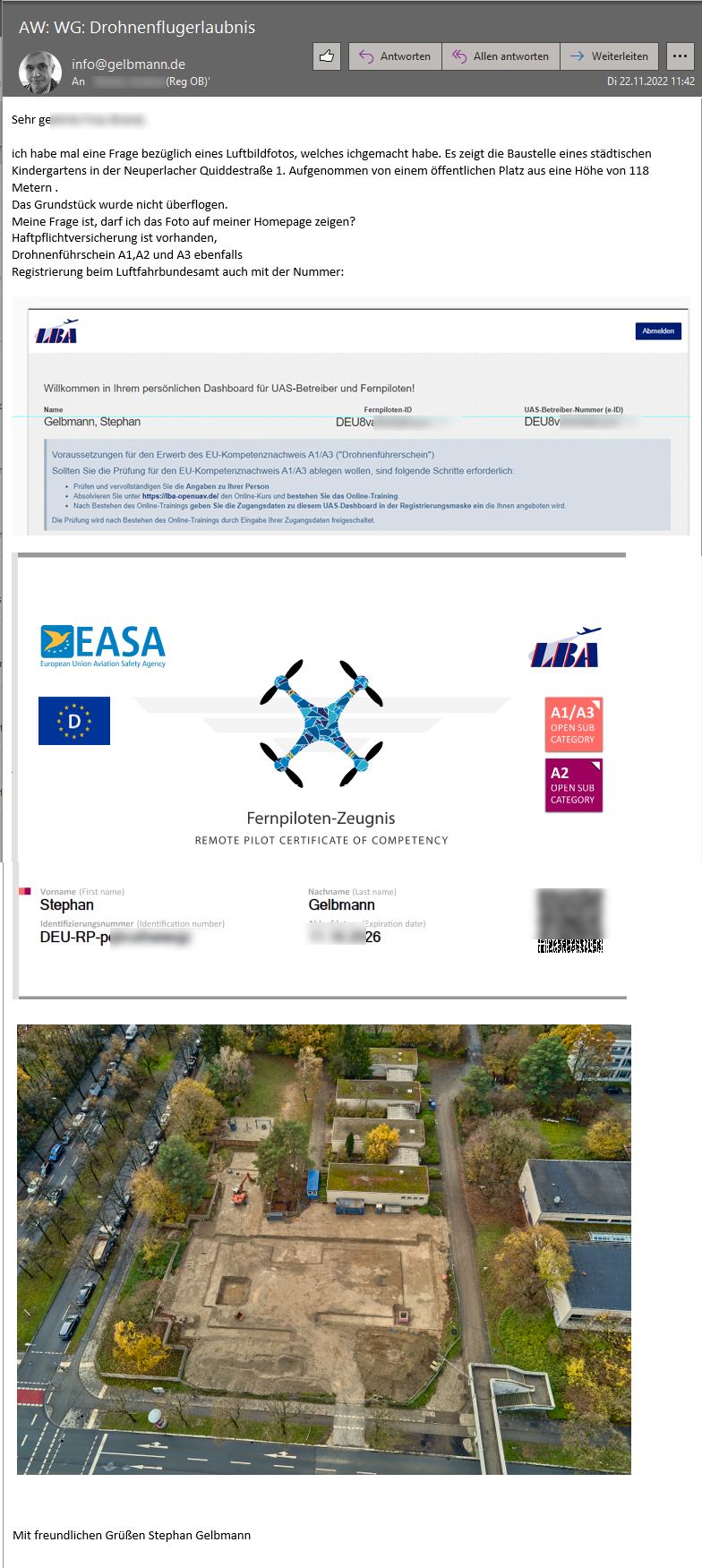 Ein Beamter der Regierung Oberbayern, Abteilung Luftamt Südbayern, der beruflich für Drohnen für Aufstiegsgenehmigungen etc... zuständig ist, beantwortet meine Anfrage nach der Rechtmäßigkeit meiner Luftbilder am 24.11.2022 mit dem Satz: