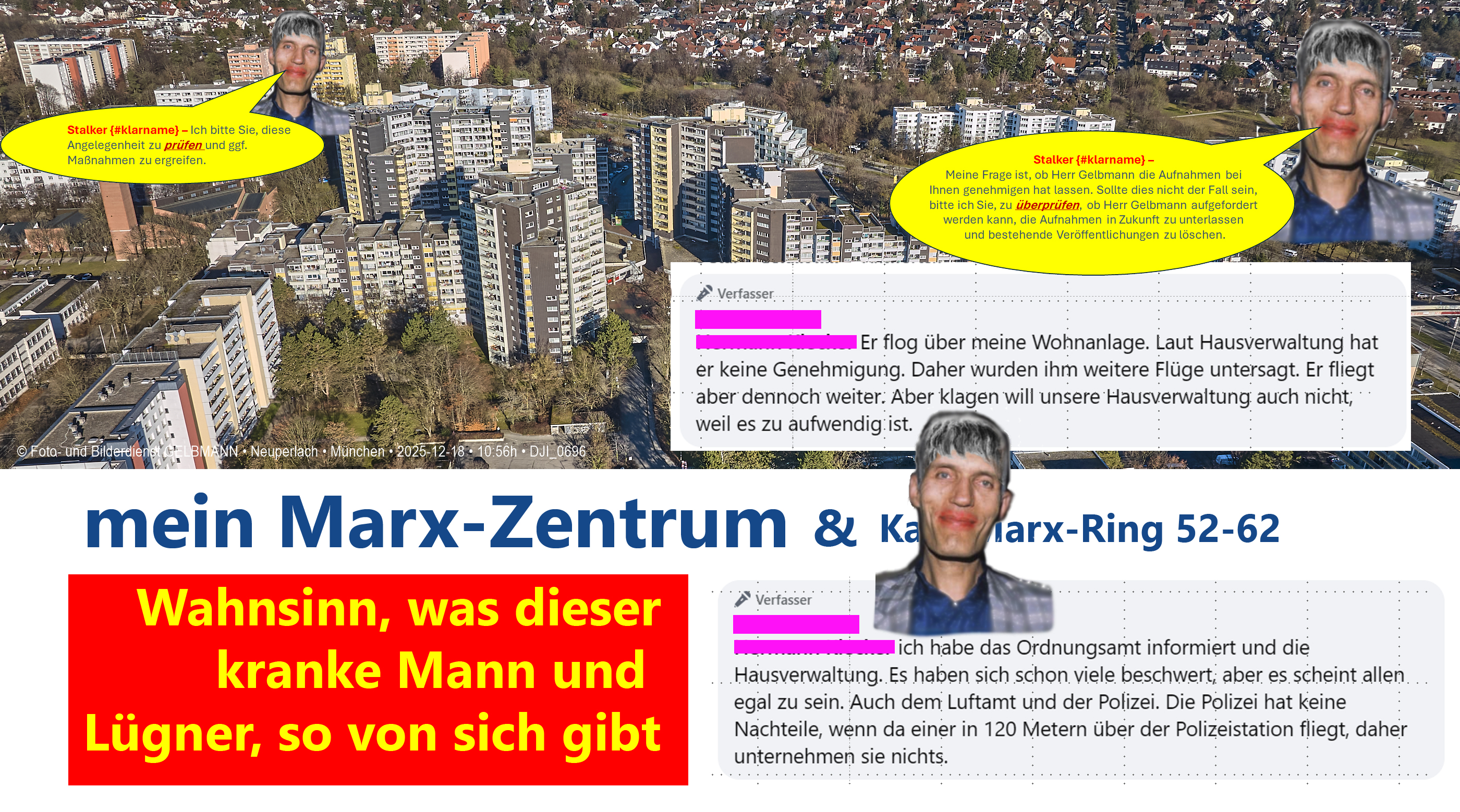 Das von meinem Fan und Verehrer oben gezeigte Foto, habe ich von meinem Balkon, im Peschelanger 7, meiner Burg, wie wir Eigentümer und Bewohner des Marx-Zentrums unsere Wohnanalge liebevoll nennen, aufgenommen und zeigt Fassadenkletterer auf dem Gebäude, Max-Kolmsperger-Straße 19, welche ein Taubennetz an der Fassade befestigen. Mein Stalker, Herr {#klarname}, der mit dem Marx-Zenrtum nichts zu tun hat, weder hier wohnt, erst Recht kein Eigentümer ist, der mich hier in seiner gewohnten Gossensprache als, "Spritzen-Opi" beschimpft, hat, wie an vielen anderen Tagen auch, offensichtlich eine große Leere in seinem Hirn. Er kann keine einzigen Facebook-Seite mit eigenen Beiträgen und Fotos bestücken, sondern ist immer auf Beiträge anderer Menschen angewiesen. So auch hier!