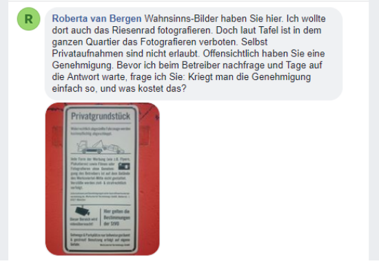Keinem, außer den direkt beteiligten, wie dem Eigentümer des Privatgeländes „Werksviertel Mitte”, oder den Firmen, welche das ganze Projekt „Riesenrad” vermarkten, geht es etwas an, ob und wer, eine Genehmigung für solche Aufnahmen hat.