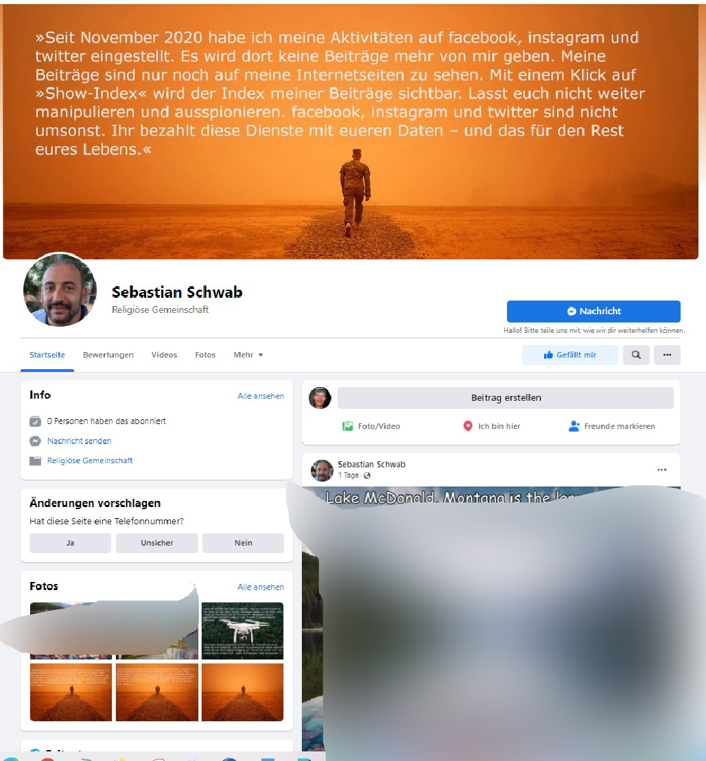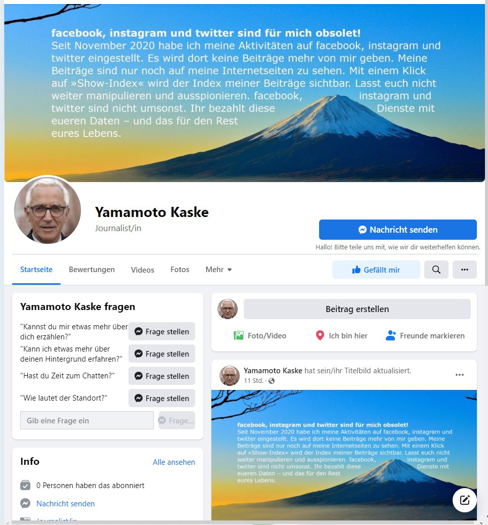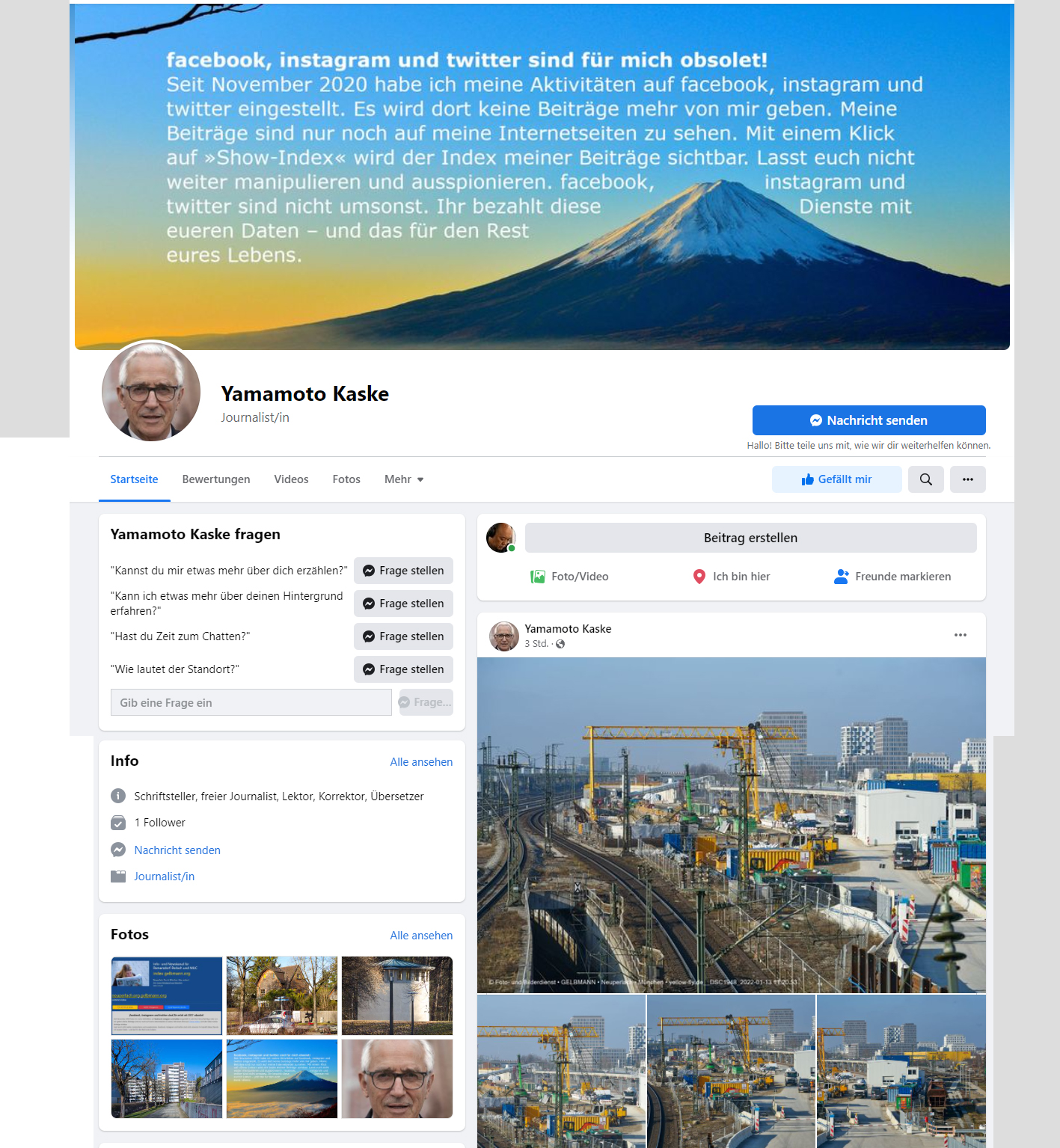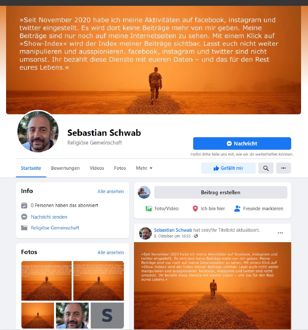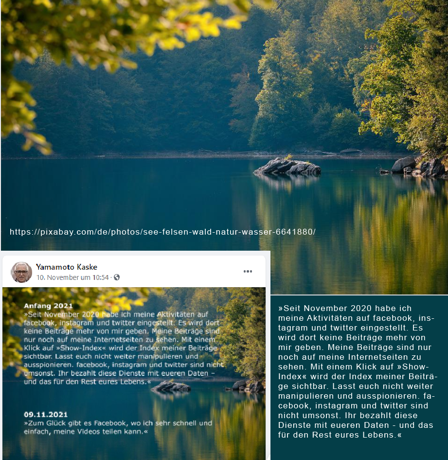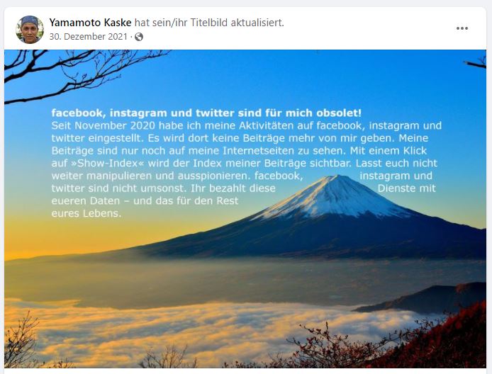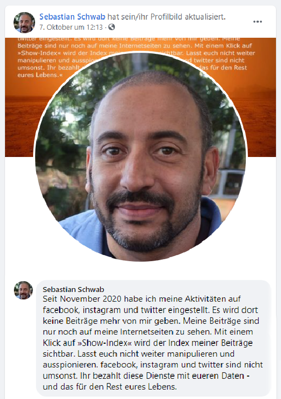 „Seit November 2020 habe ich meine Aktivitäten auf facebook, instagram und twitter eingestellt. Es wird dort keine Beiträge mehr von mir geben. Meine Beiträge sind nur noch auf meine Internetseiten zu sehen. Mit einem Klick auf »Show-Index« wird der Index meiner Beiträge sichtbar. Lasst euch nicht weiter manipulieren und ausspionieren. facebook, instagram und twitter sind nicht umsonst. Ihr bezahlt diese Dienste mit eueren Daten - und das für den Rest eures Lebens.“