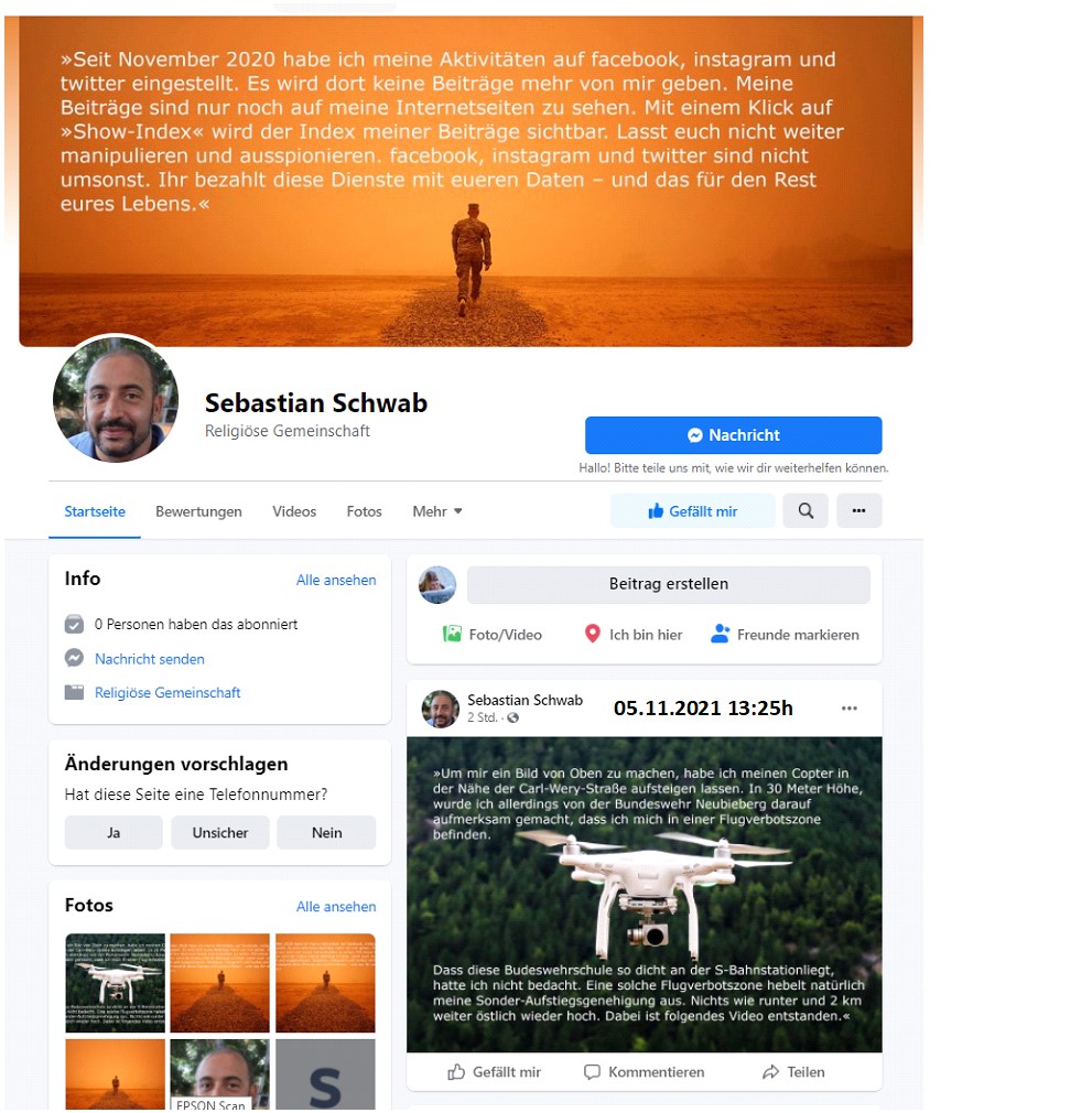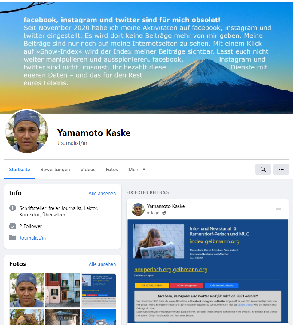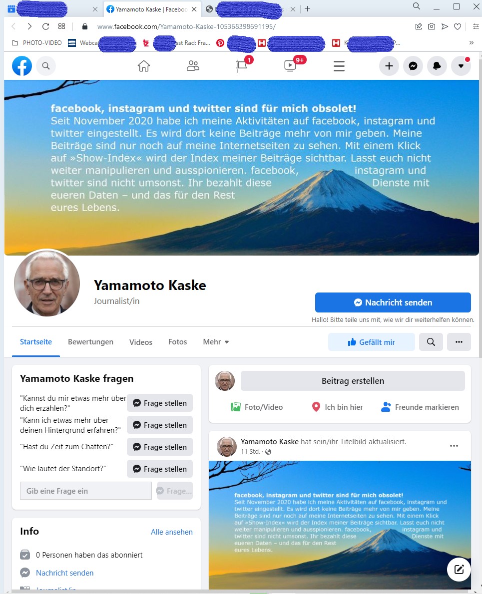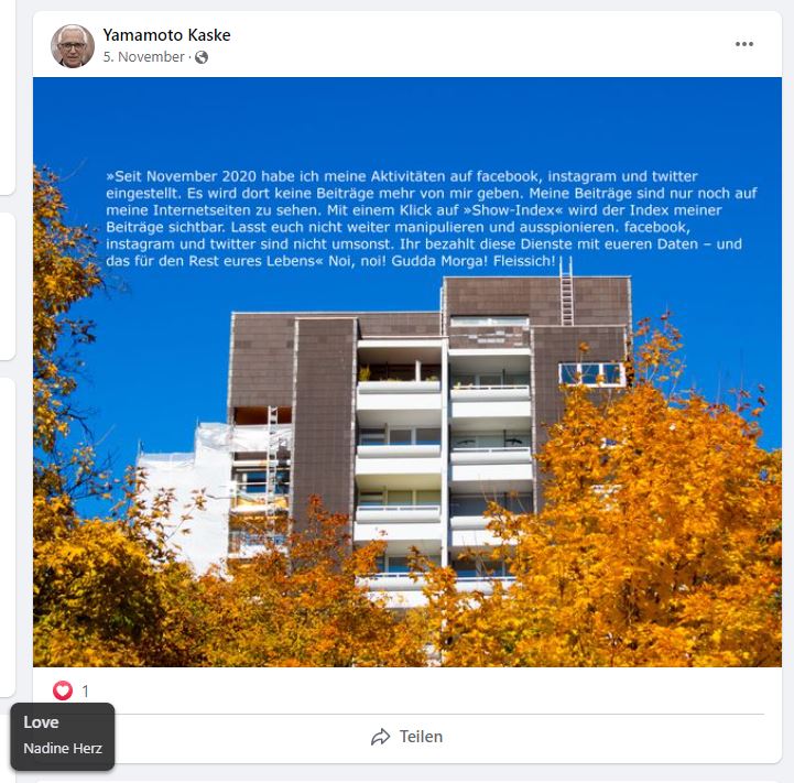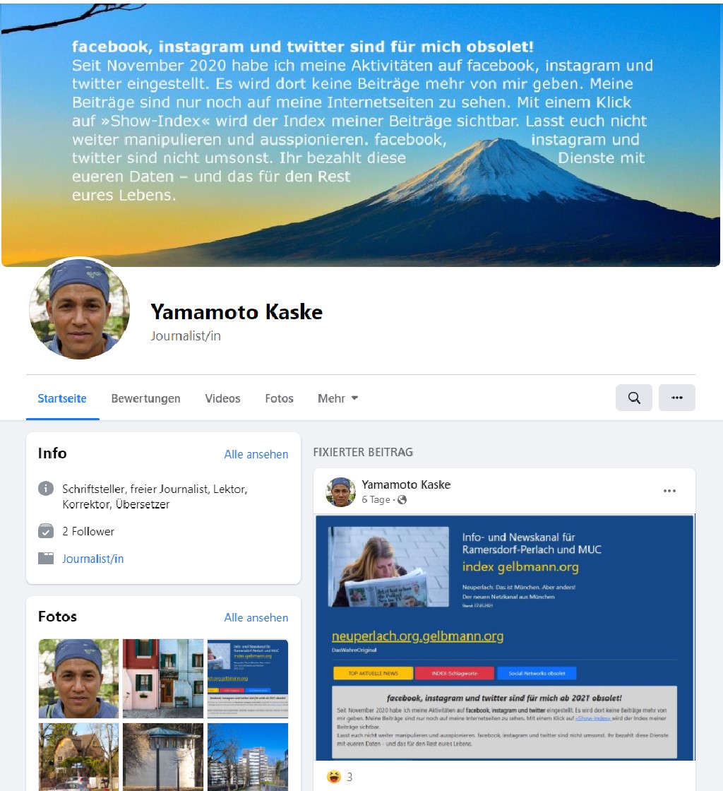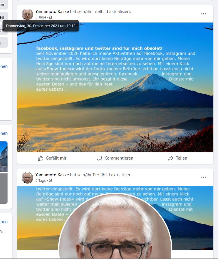 „Seit November 2020 habe ich meine Aktivitäten auf facebook, instagram und twitter eingestellt. Es wird dort keine Beiträge mehr von mir geben. Meine Beiträge sind nur noch auf meine Internetseiten zu sehen. Mit einem Klick auf »Show-Index« wird der Index meiner Beiträge sichtbar. Lasst euch nicht weiter manipulieren und ausspionieren. facebook, instagram und twitter sind nicht umsonst. Ihr bezahlt diese Dienste mit eueren Daten - und das für den Rest eures Lebens.“