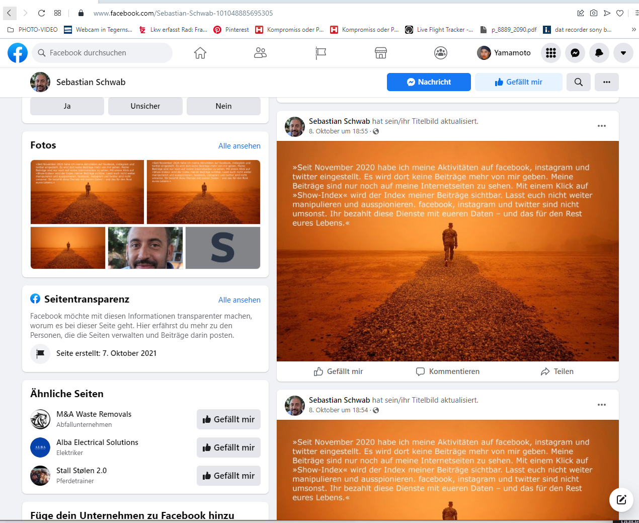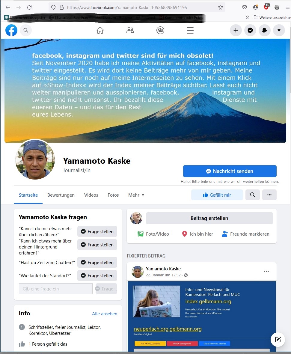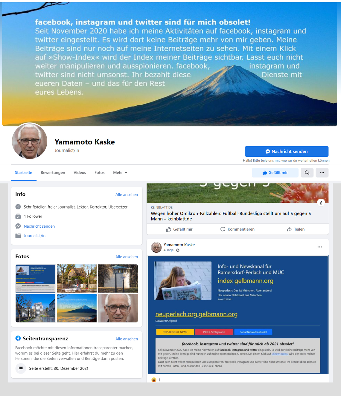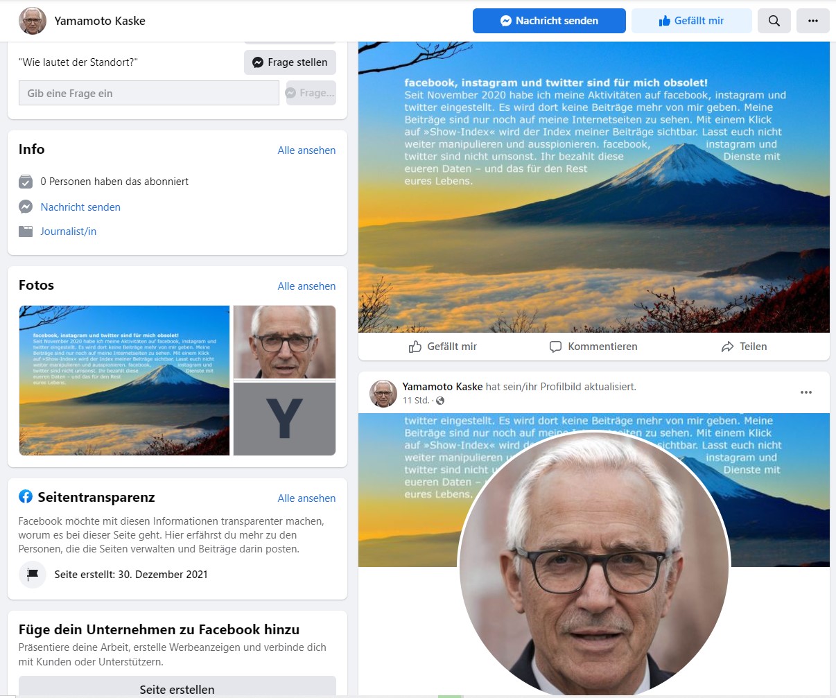 „Seit November 2020 habe ich meine Aktivitäten auf facebook, instagram und twitter eingestellt. Es wird dort keine Beiträge mehr von mir geben. Meine Beiträge sind nur noch auf meine Internetseiten zu sehen. Mit einem Klick auf »Show-Index« wird der Index meiner Beiträge sichtbar. Lasst euch nicht weiter manipulieren und ausspionieren. facebook, instagram und twitter sind nicht umsonst. Ihr bezahlt diese Dienste mit eueren Daten - und das für den Rest eures Lebens.“