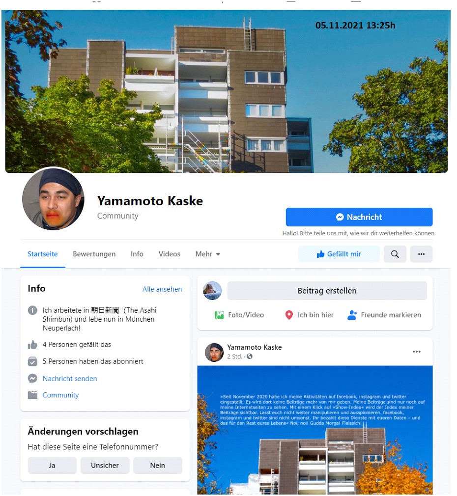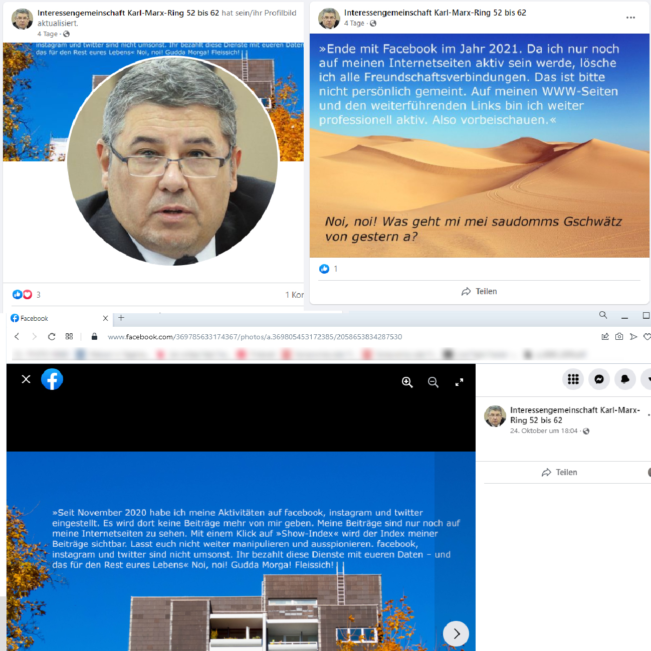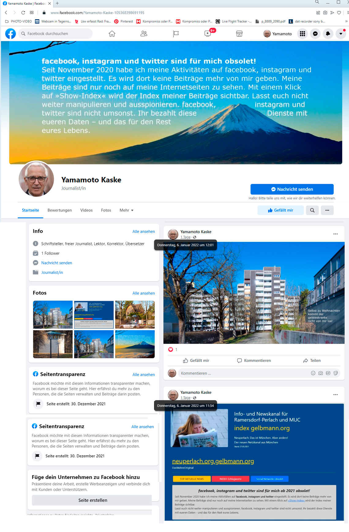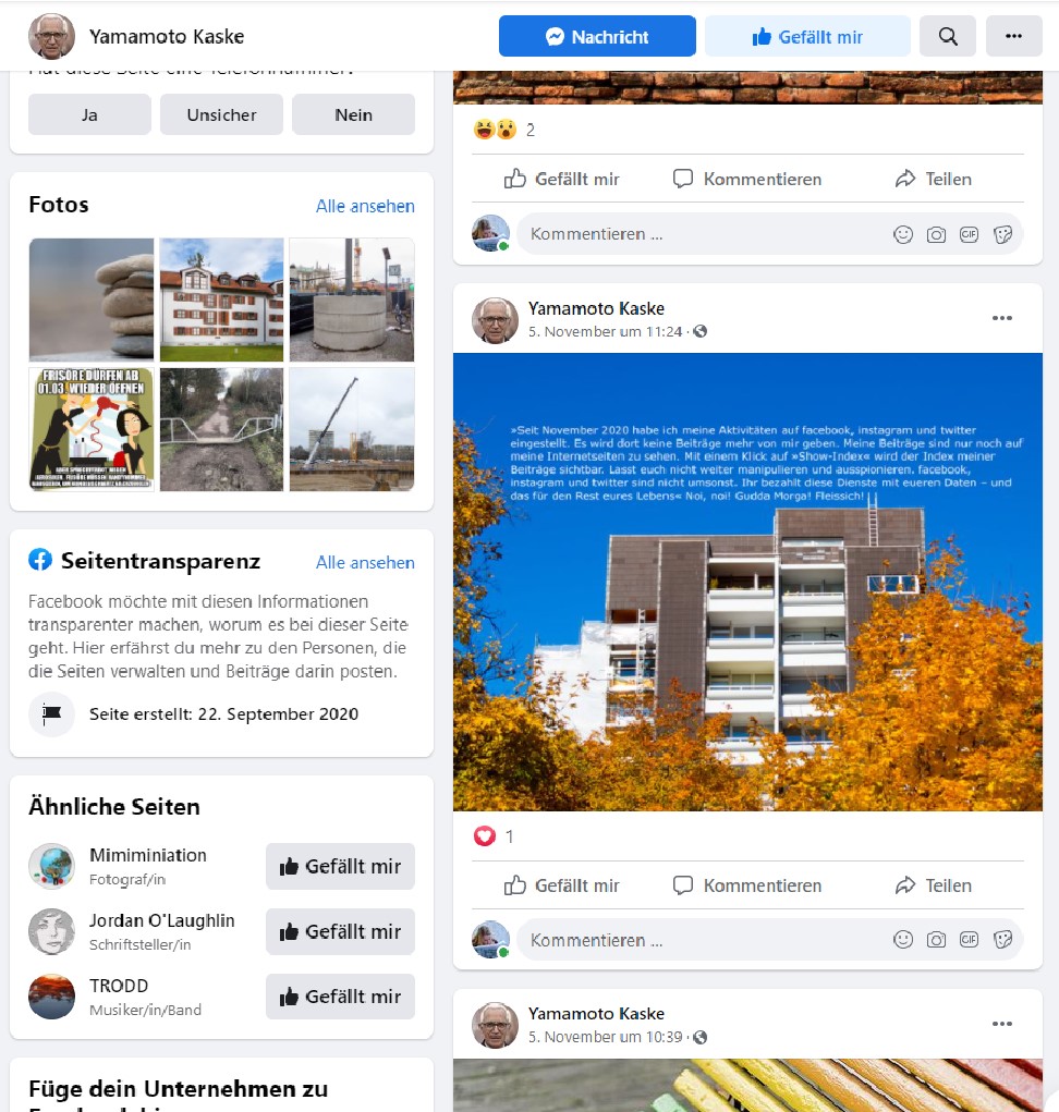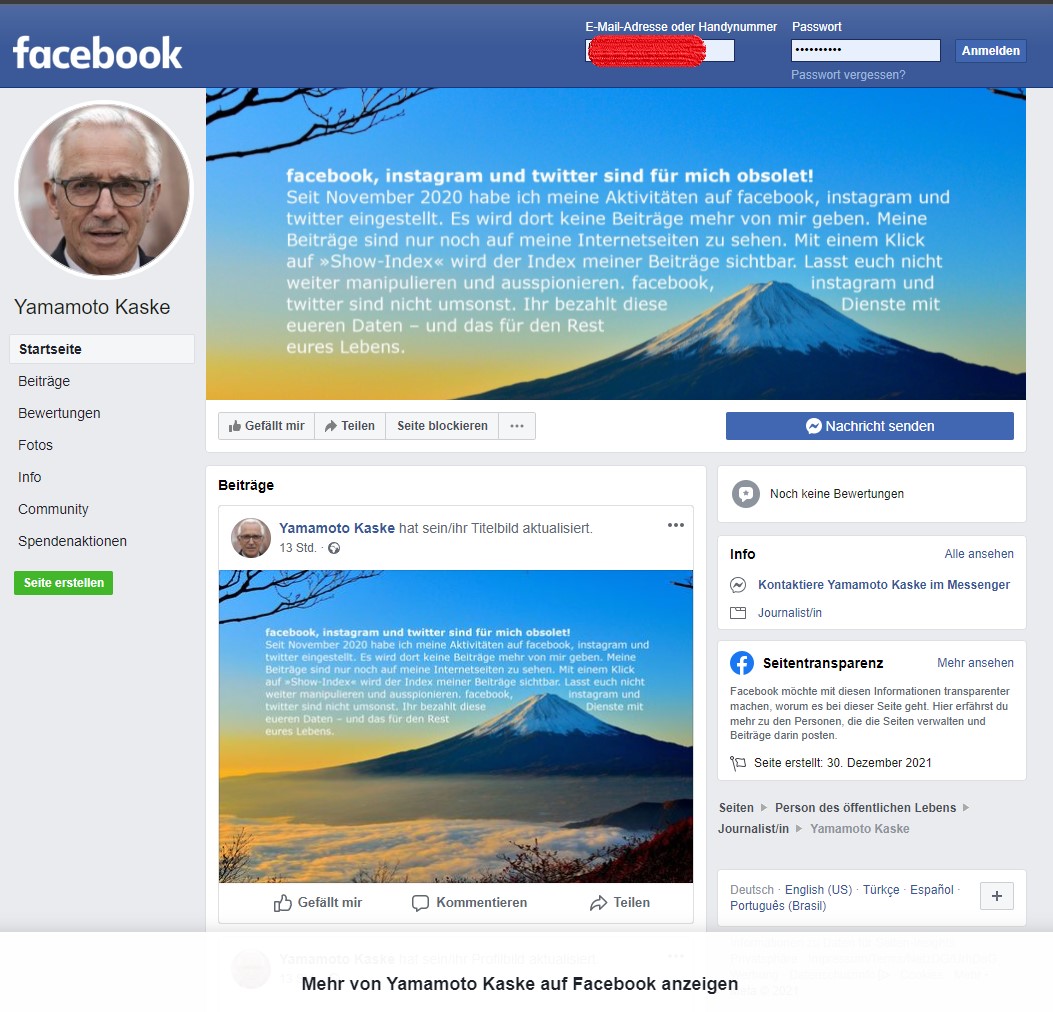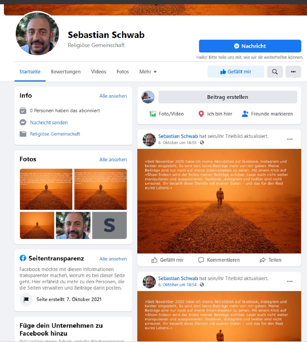 „Seit November 2020 habe ich meine Aktivitäten auf facebook, instagram und twitter eingestellt. Es wird dort keine Beiträge mehr von mir geben. Meine Beiträge sind nur noch auf meine Internetseiten zu sehen. Mit einem Klick auf »Show-Index« wird der Index meiner Beiträge sichtbar. Lasst euch nicht weiter manipulieren und ausspionieren. facebook, instagram und twitter sind nicht umsonst. Ihr bezahlt diese Dienste mit eueren Daten - und das für den Rest eures Lebens.“