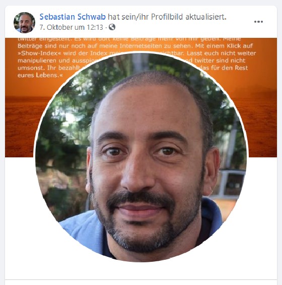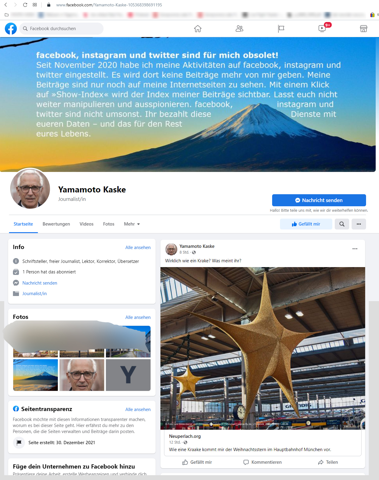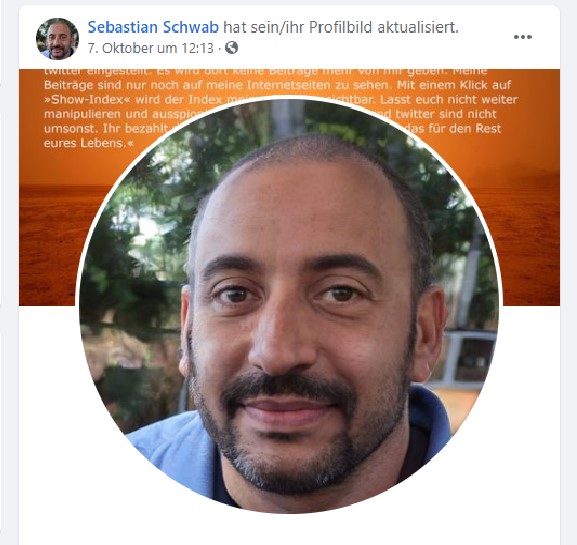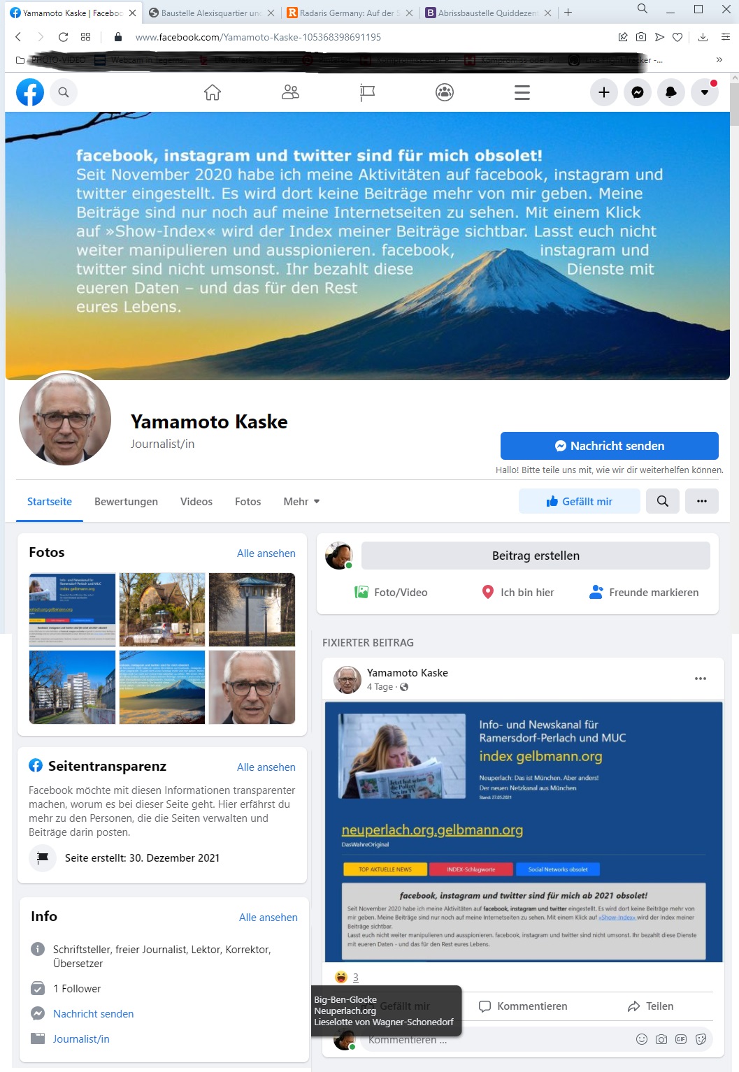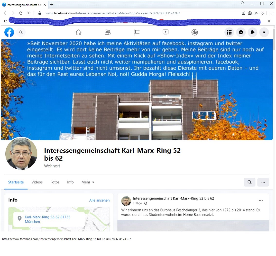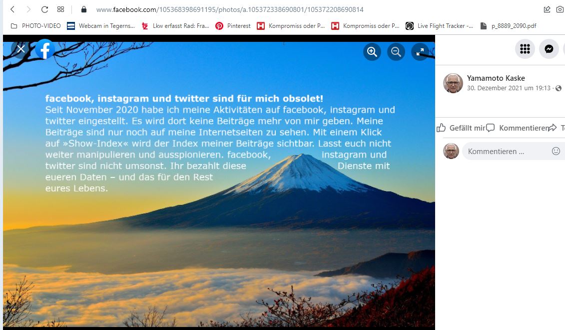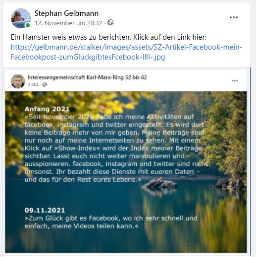 „Seit November 2020 habe ich meine Aktivitäten auf facebook, instagram und twitter eingestellt. Es wird dort keine Beiträge mehr von mir geben. Meine Beiträge sind nur noch auf meine Internetseiten zu sehen. Mit einem Klick auf »Show-Index« wird der Index meiner Beiträge sichtbar. Lasst euch nicht weiter manipulieren und ausspionieren. facebook, instagram und twitter sind nicht umsonst. Ihr bezahlt diese Dienste mit eueren Daten - und das für den Rest eures Lebens.“