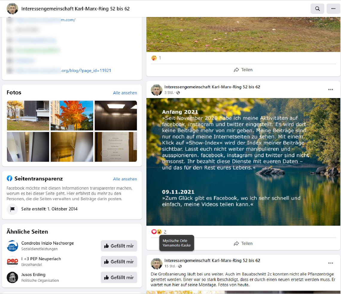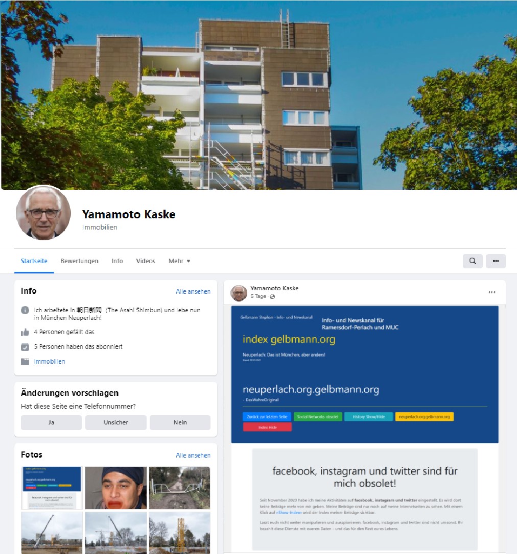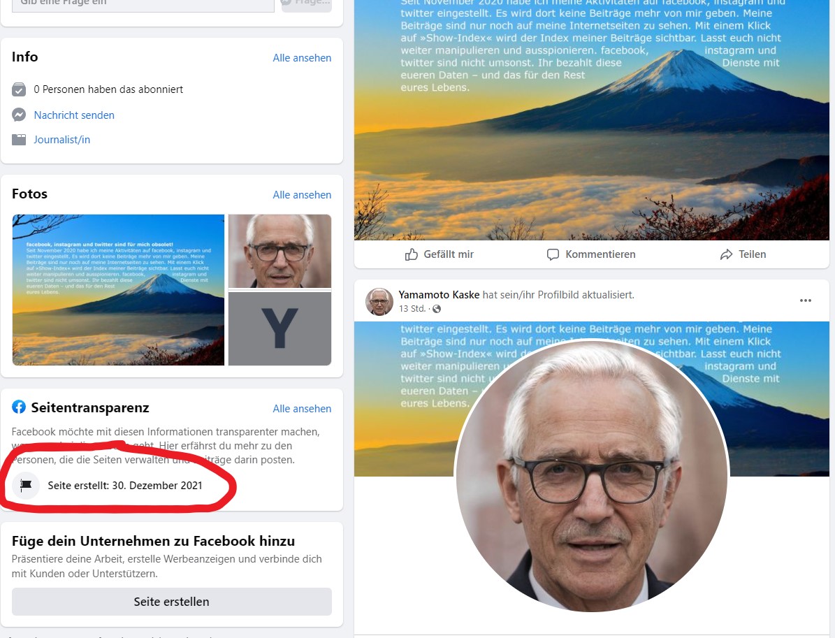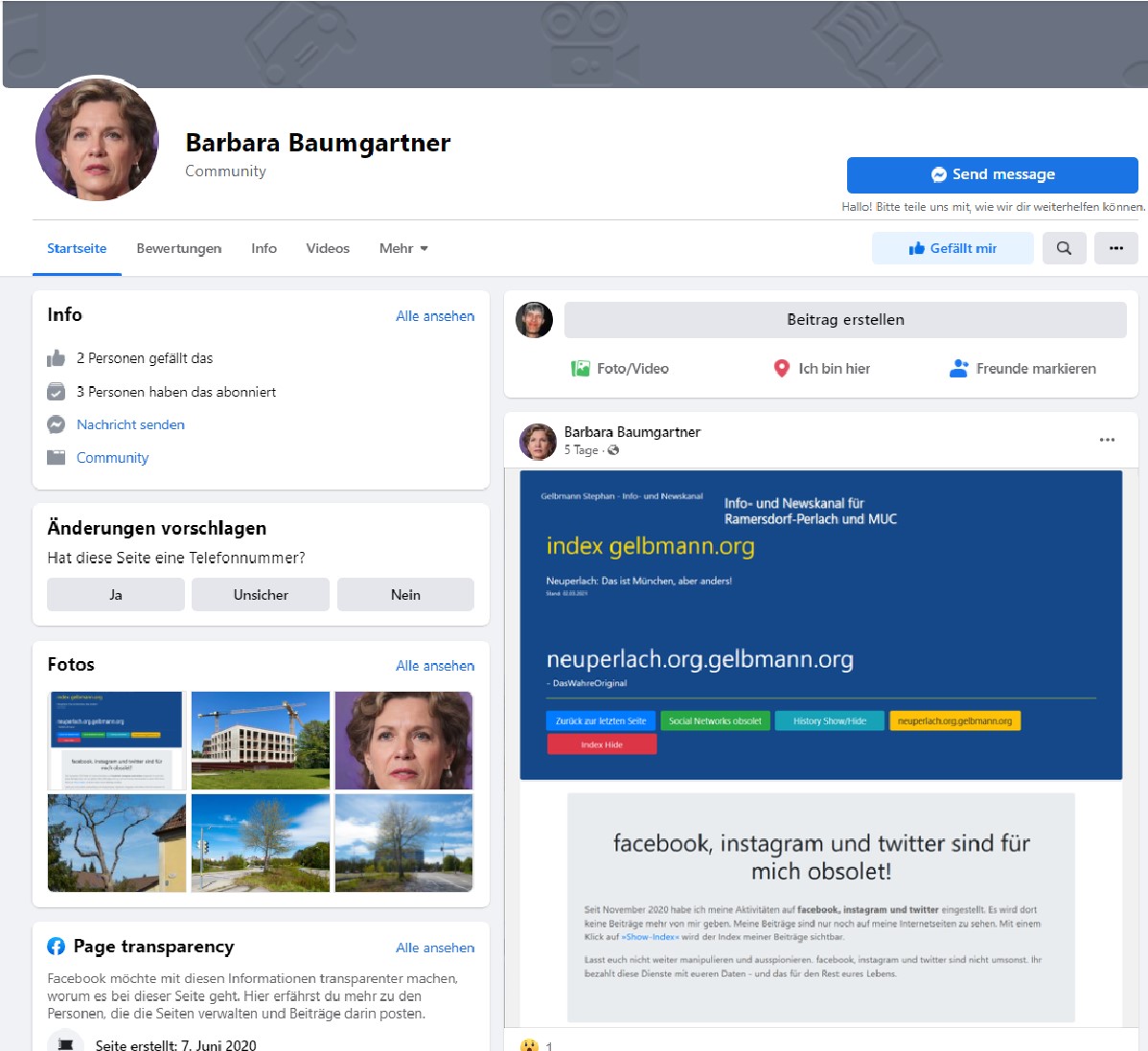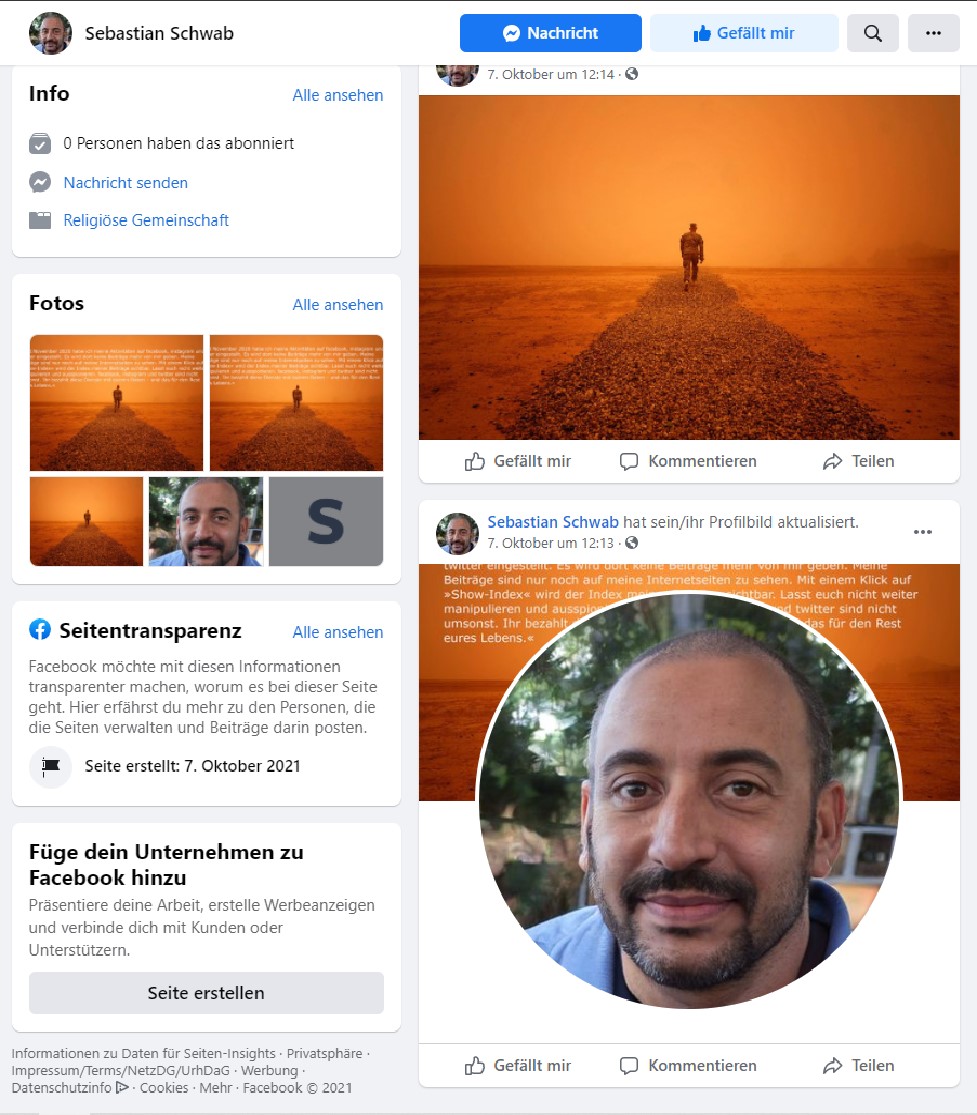 „Seit November 2020 habe ich meine Aktivitäten auf facebook, instagram und twitter eingestellt. Es wird dort keine Beiträge mehr von mir geben. Meine Beiträge sind nur noch auf meine Internetseiten zu sehen. Mit einem Klick auf »Show-Index« wird der Index meiner Beiträge sichtbar. Lasst euch nicht weiter manipulieren und ausspionieren. facebook, instagram und twitter sind nicht umsonst. Ihr bezahlt diese Dienste mit eueren Daten - und das für den Rest eures Lebens.“